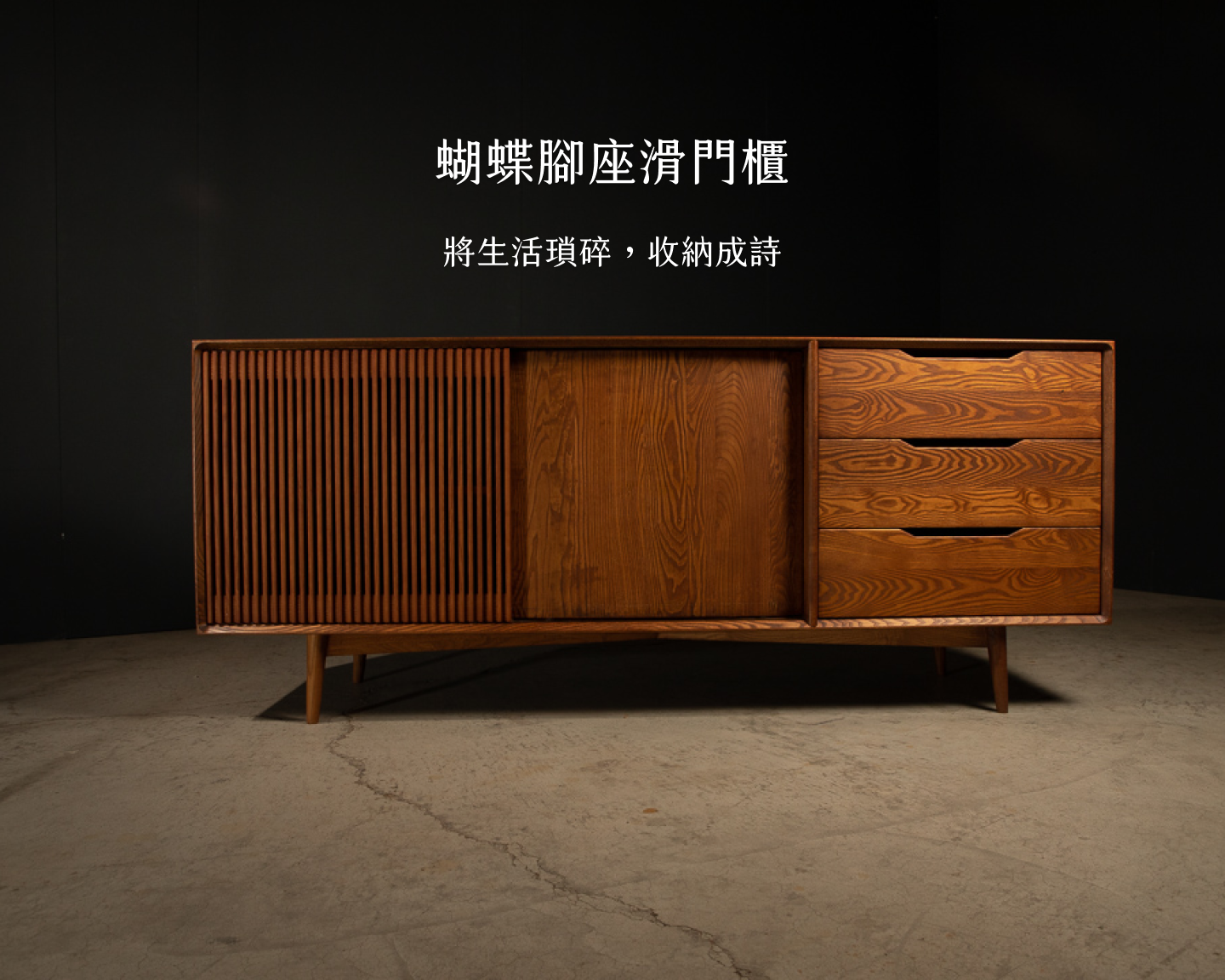 採用FAS最高等級梣木全手工打造的滑門櫃,獨家「抗扭力蝴蝶腳座」,大幅提高承重耐震,櫃體屹立穩固。從實木櫃體到格柵滑門,從內到外,360度皆經「五塗五磨」細緻工序,延展出溫潤沈穩的通透美學。