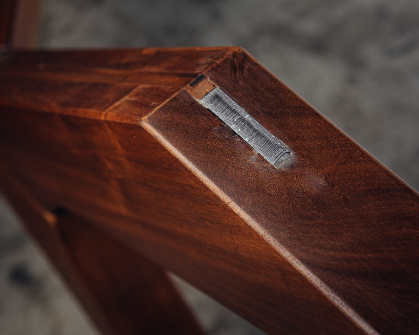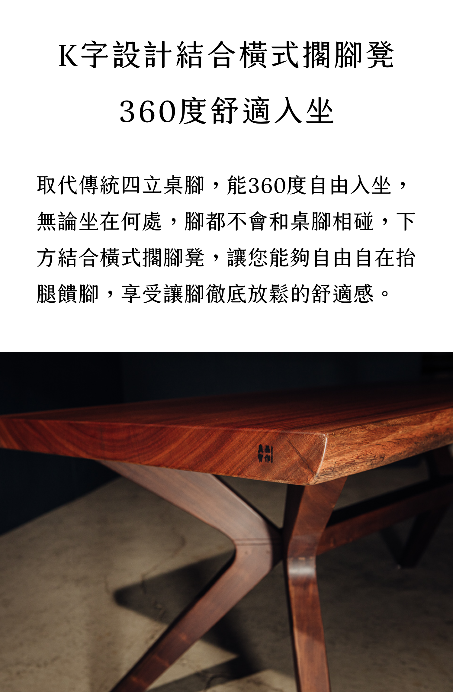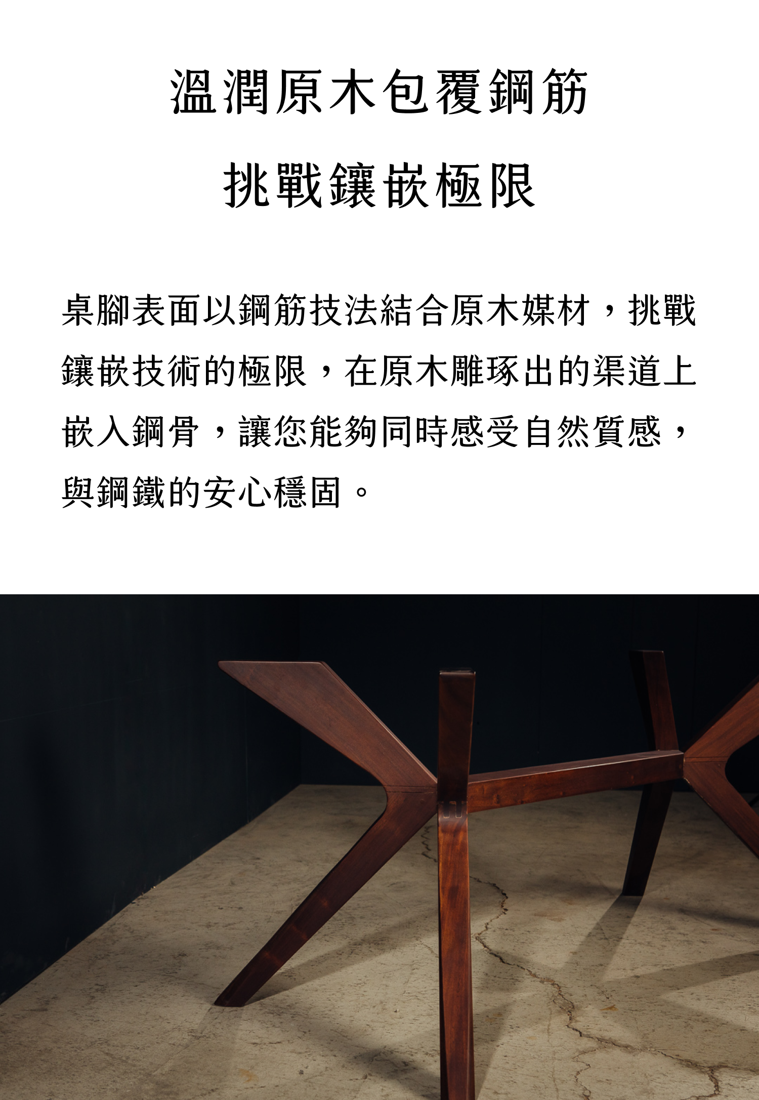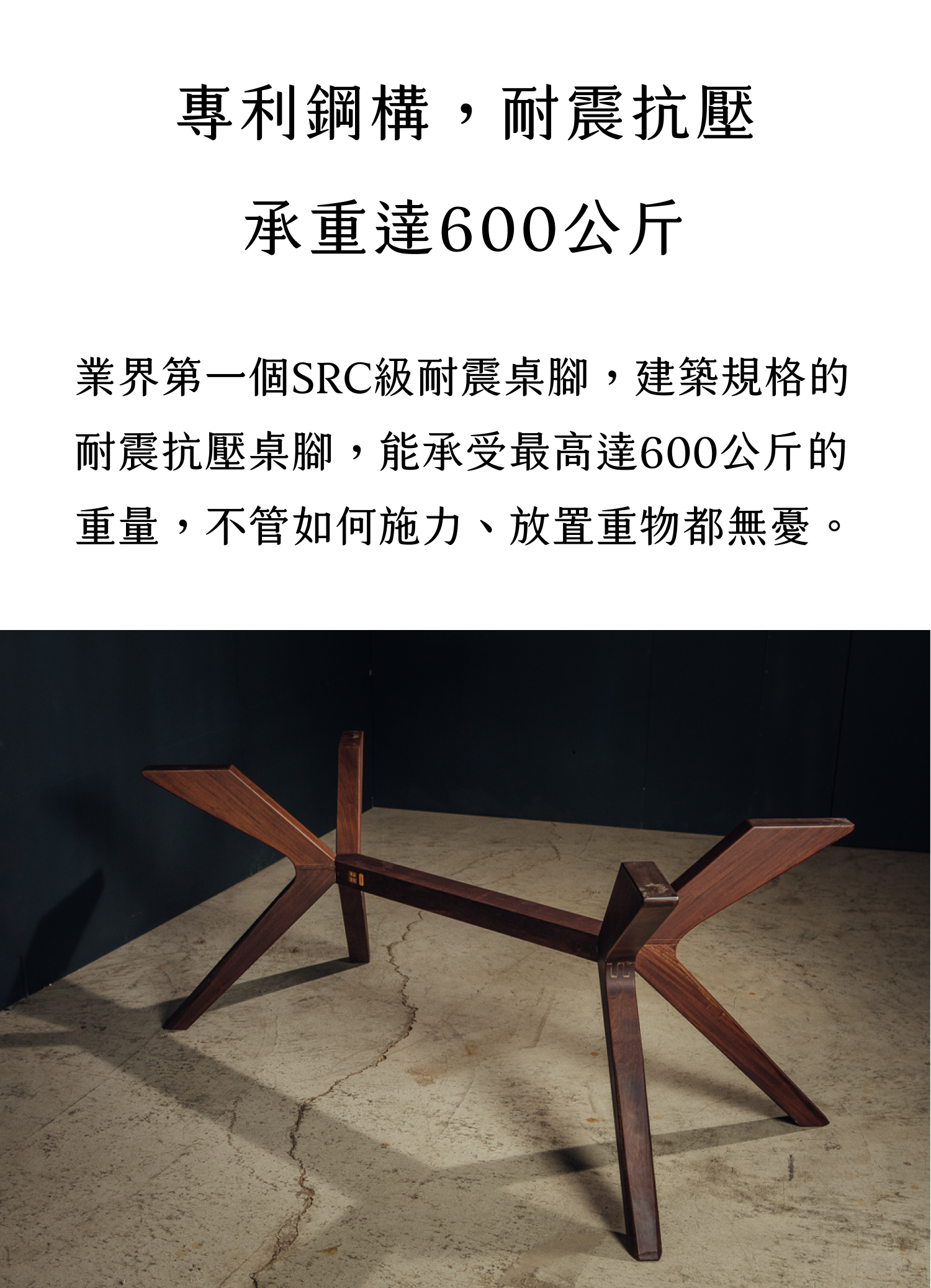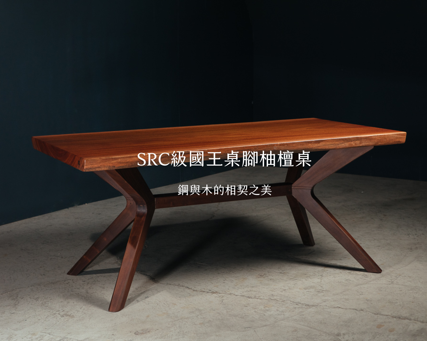 通過獨創技術,在原木雕琢出的渠道上嵌入鋼骨,打造出市面第一個結合堅固鋼骨和温暖原木,技術與藝術兼具的「SRC級國王桌腳」,為原本單調的桌腳系統,創下前所未有的革新。