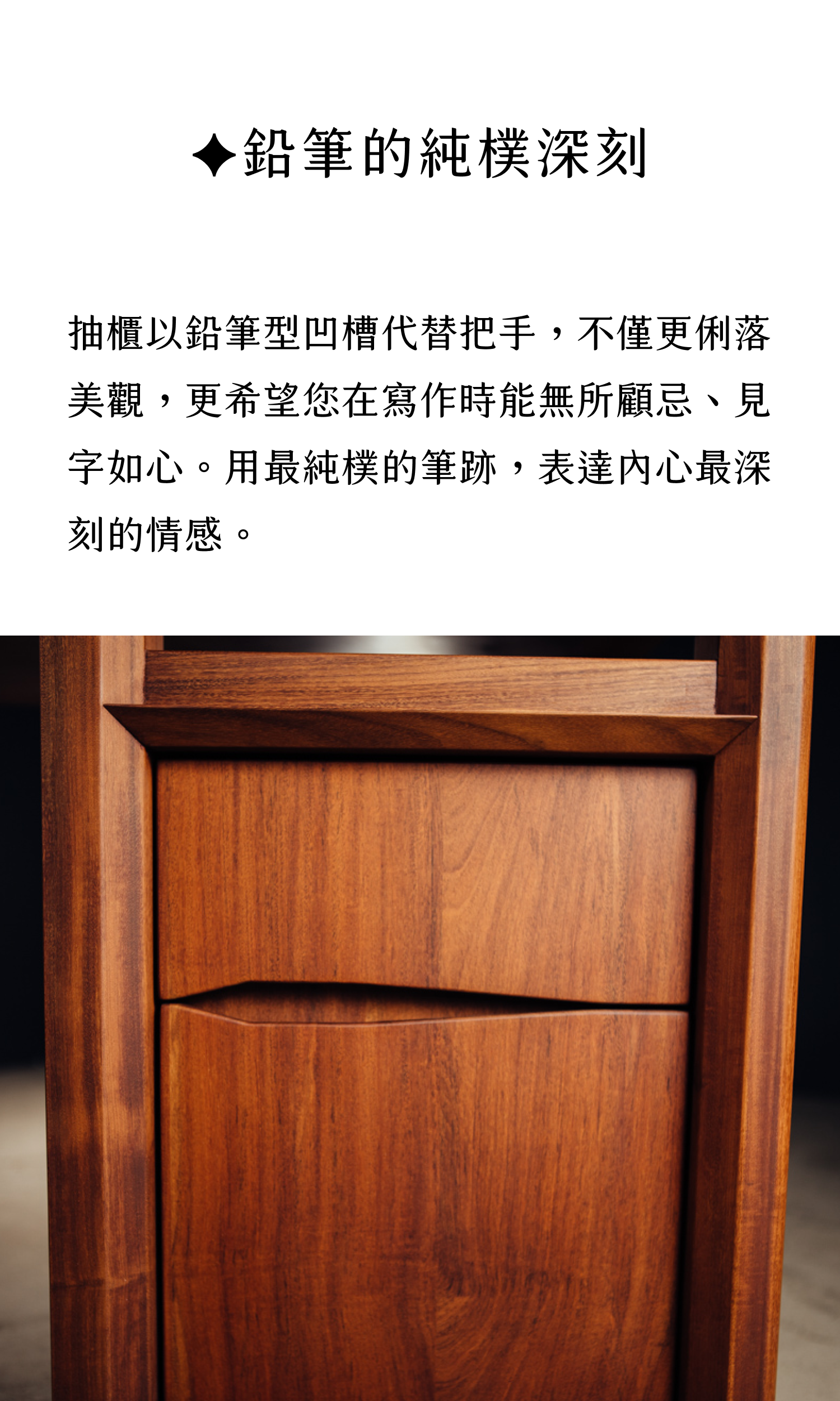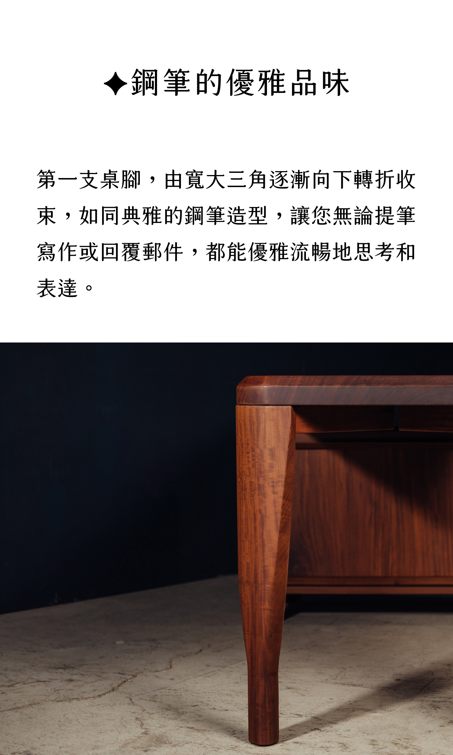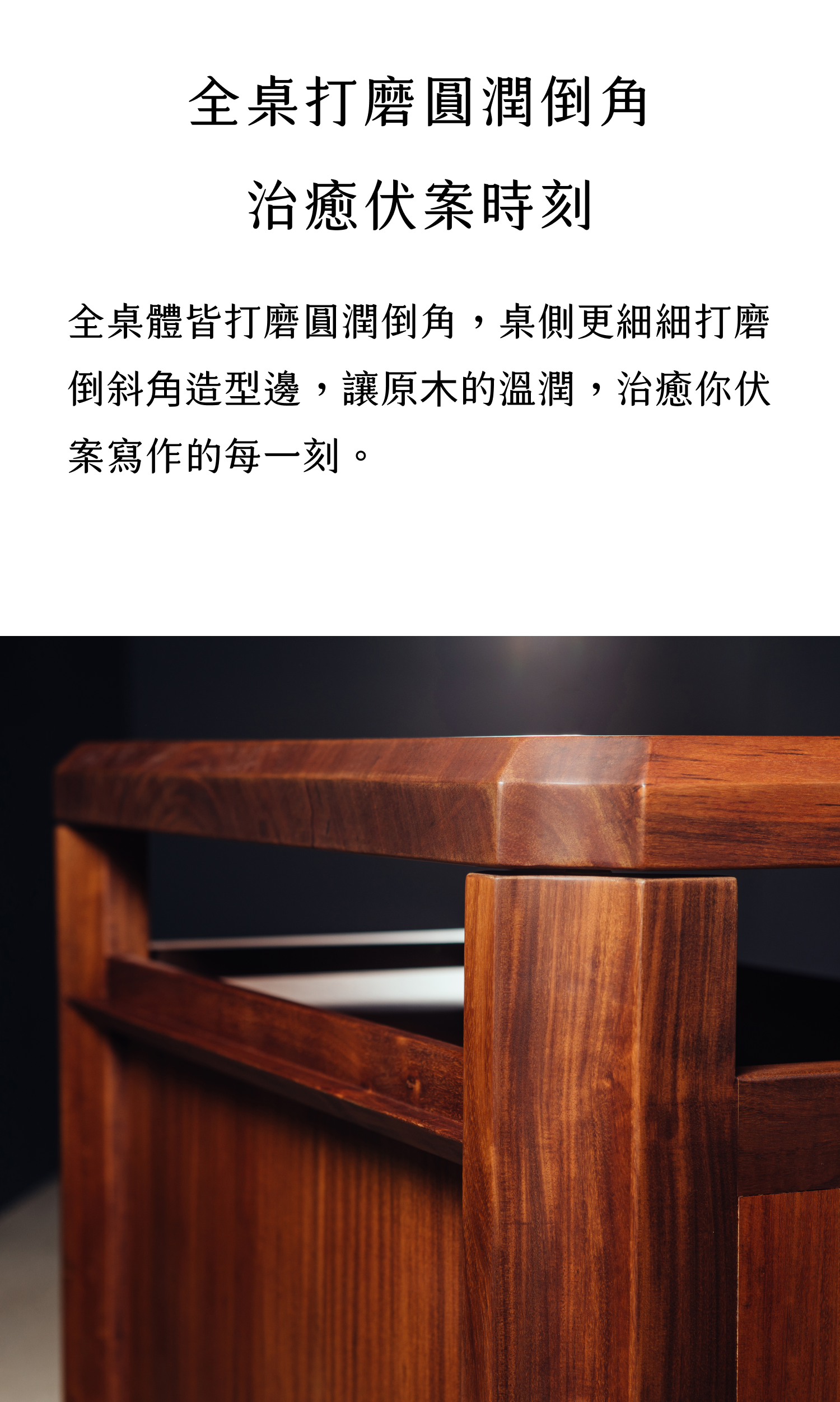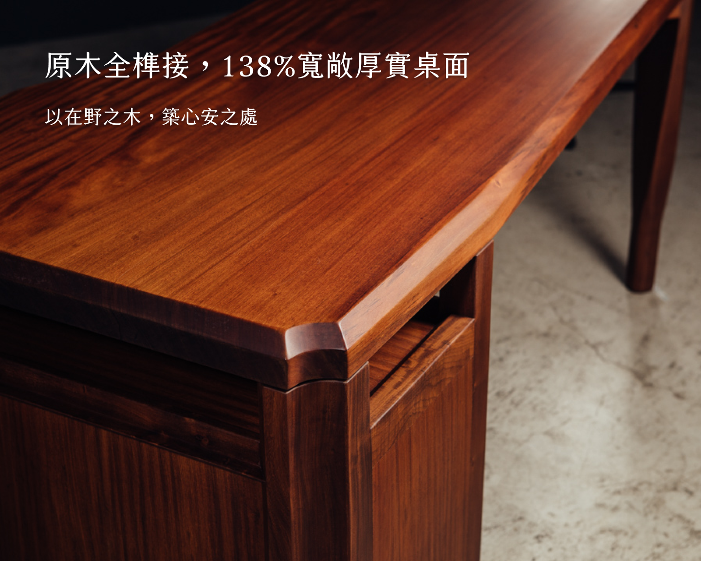 寫字桌主體採用沉穩內斂的厚實原木,如大理石般的細緻木紋,低調非凡,結構堅實桌體,由職人精研全榫接,滿足您對原木的鍾情。
