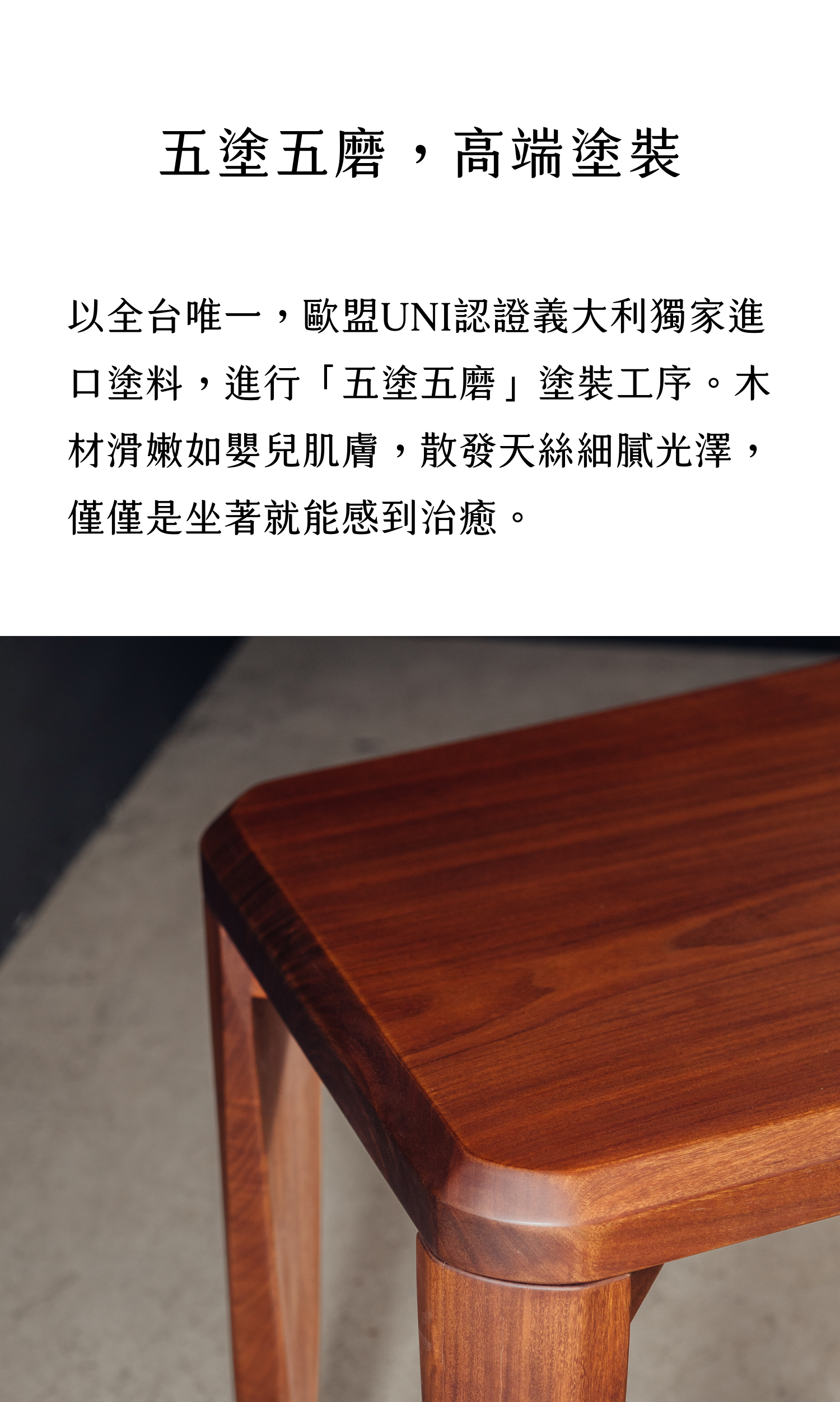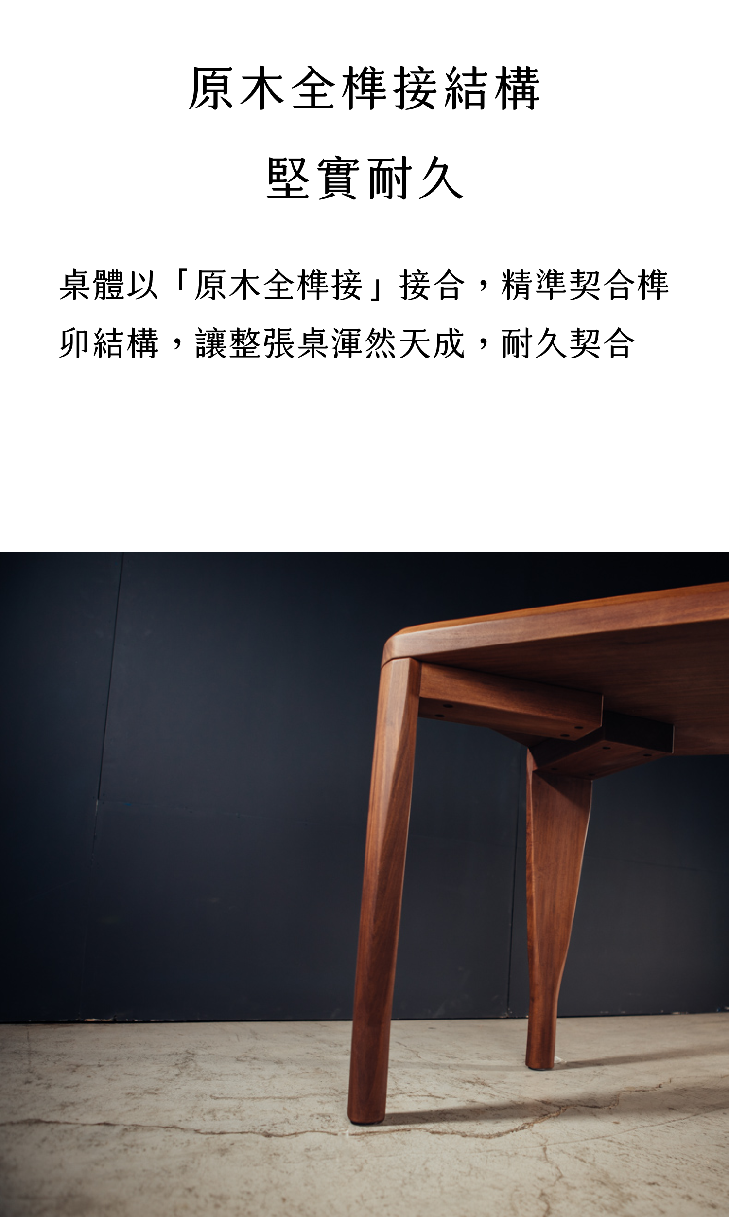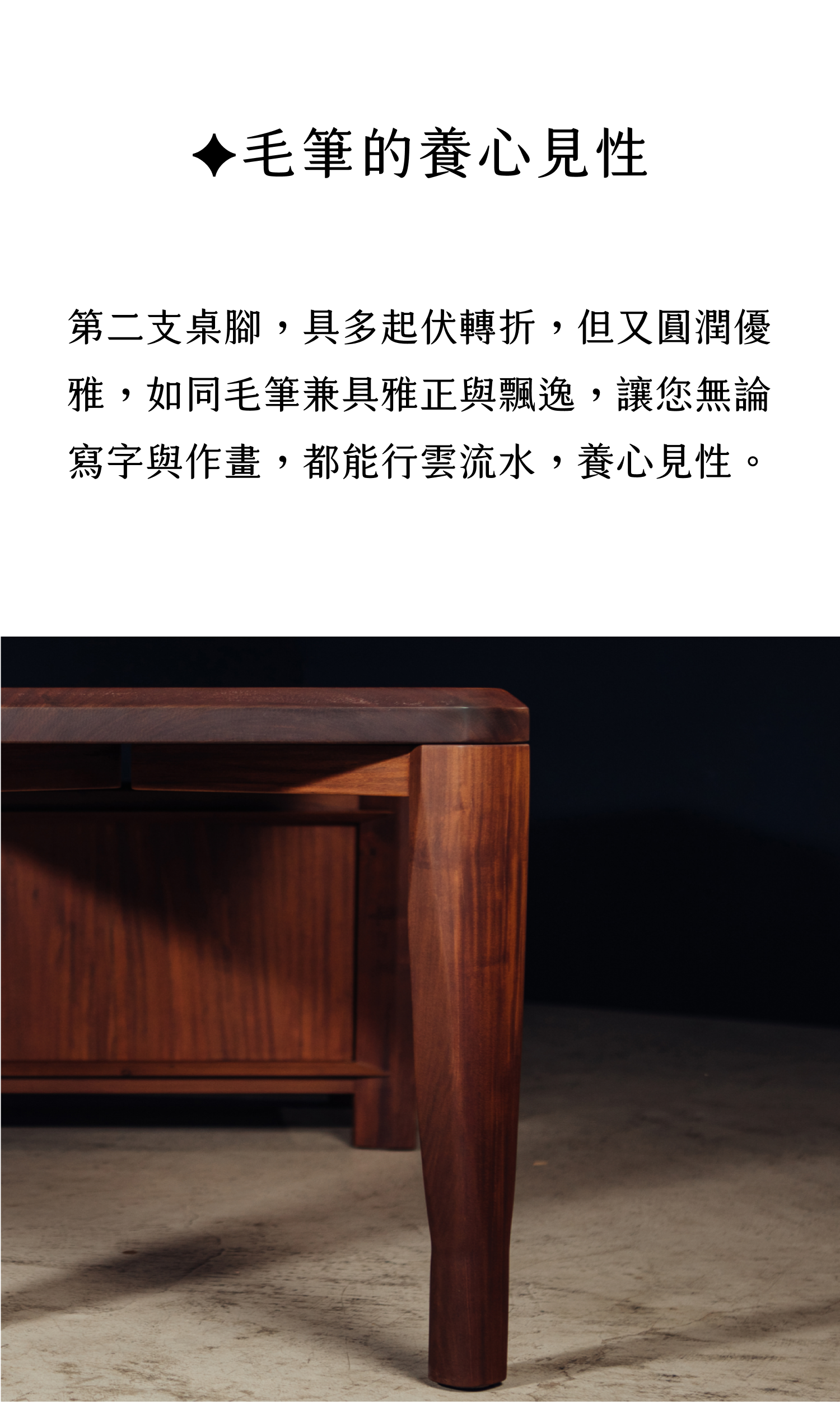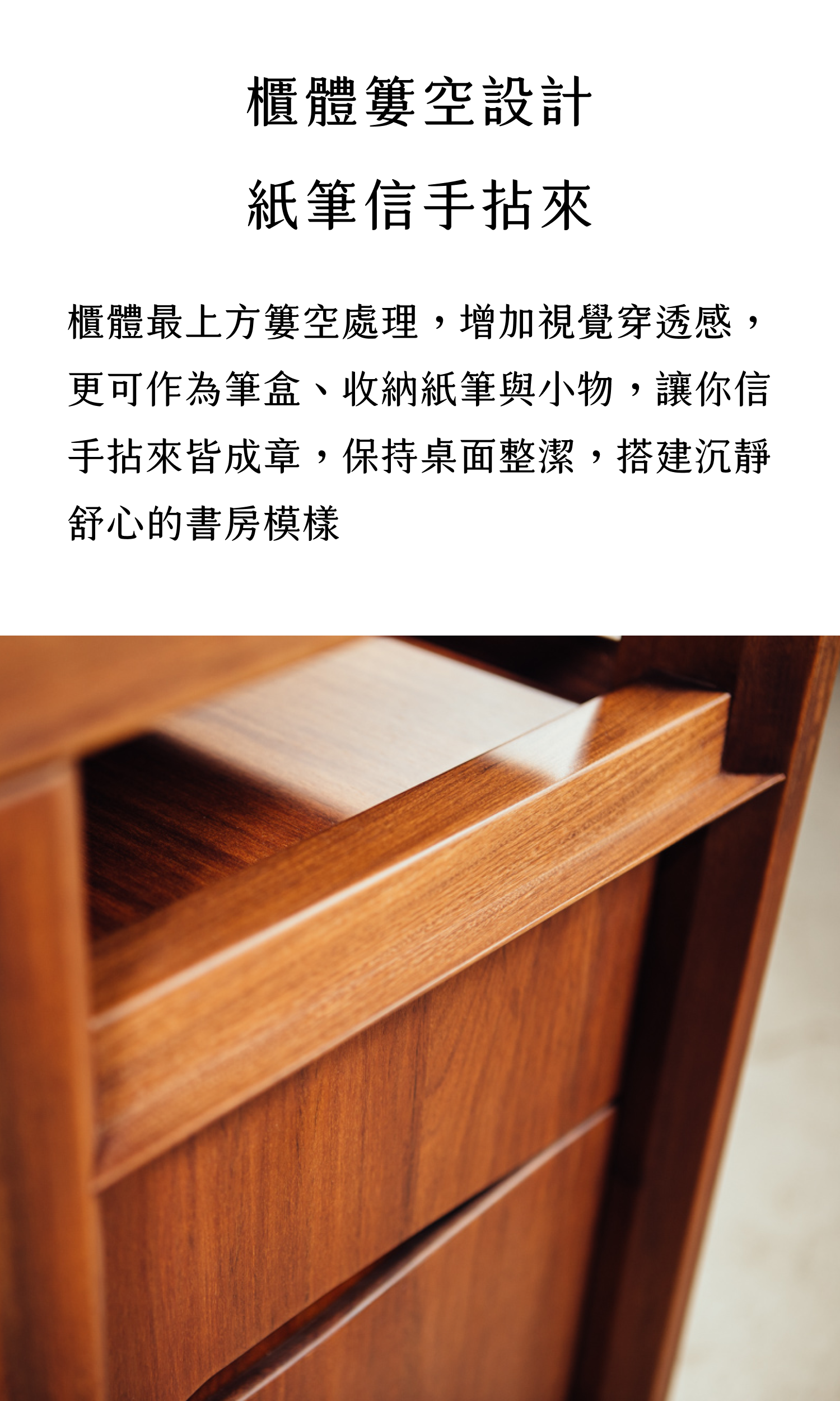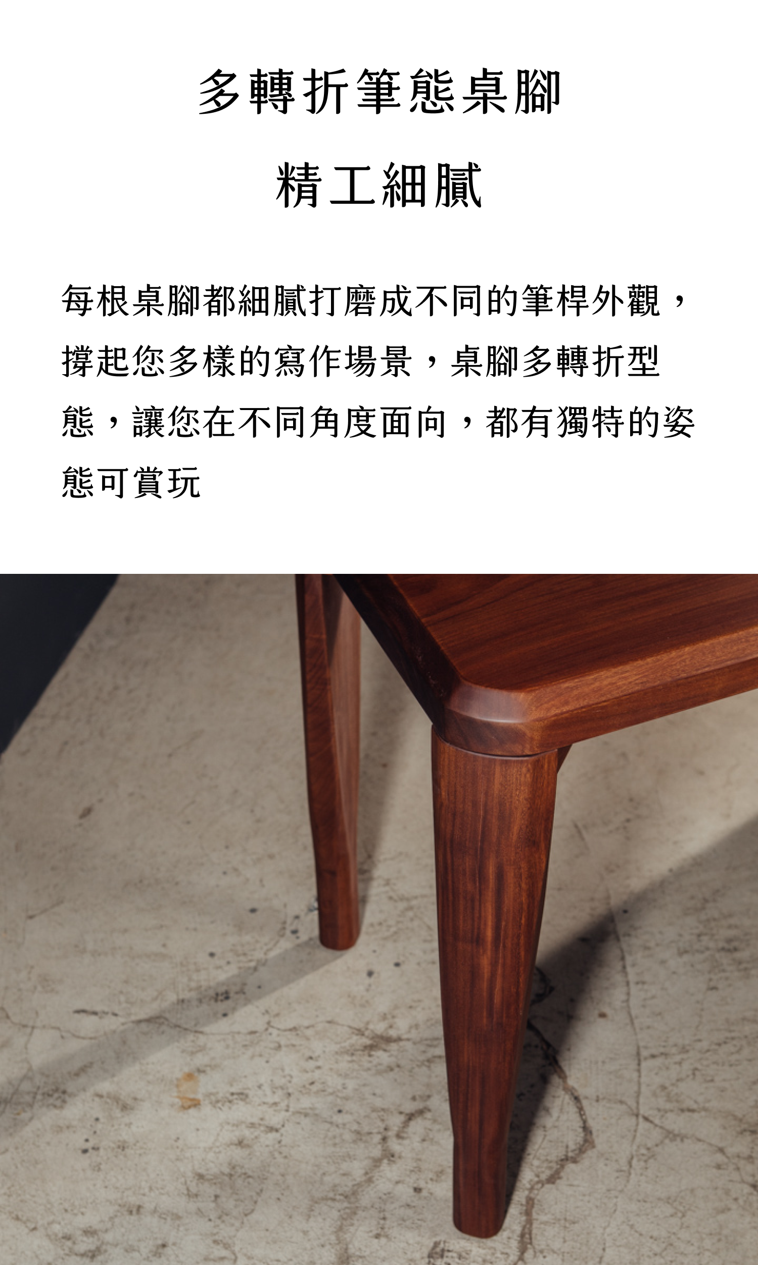 寫字桌主體採用沉穩內斂的厚實原木,如大理石般的細緻木紋,低調非凡,結構堅實桌體,由職人精研全榫接,滿足您對原木的鍾情。